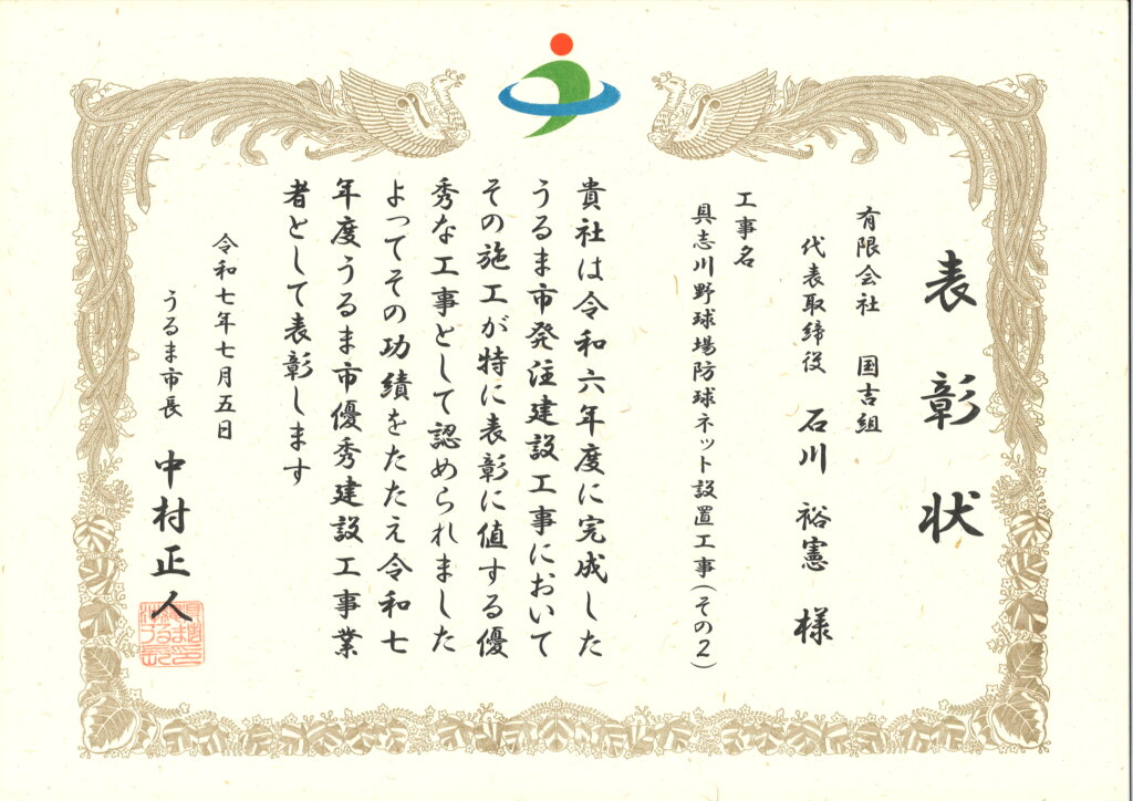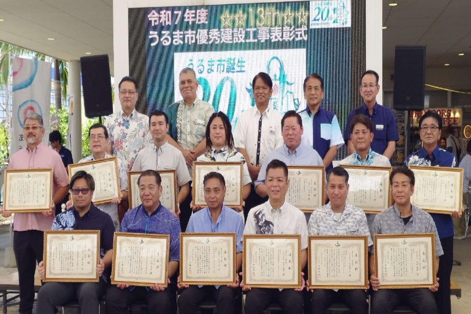 2025.07.08 受賞・表彰 令和7年度 うるま市優秀建設工事表彰 7月5日(土)に、令和7年度うるま市優秀建設工事表彰式がうるマルシェにて開催され、 「具志川野球場防球ネット設置工事(その2)」が優秀建設工事に選ばれました! 本工事に携わっていただいた関係各位、また、ご協力いただいた自治会をはじめ近隣住民の皆様 皆様方のお陰を持ちまして受賞することができました。 今後とも技術の向上に努めてまいります。ありがとうございました! 照屋さん、豊濱さん、おめでとうございます! https://www.city.uruma.lg.jp/1001005000/contents/4463.html
